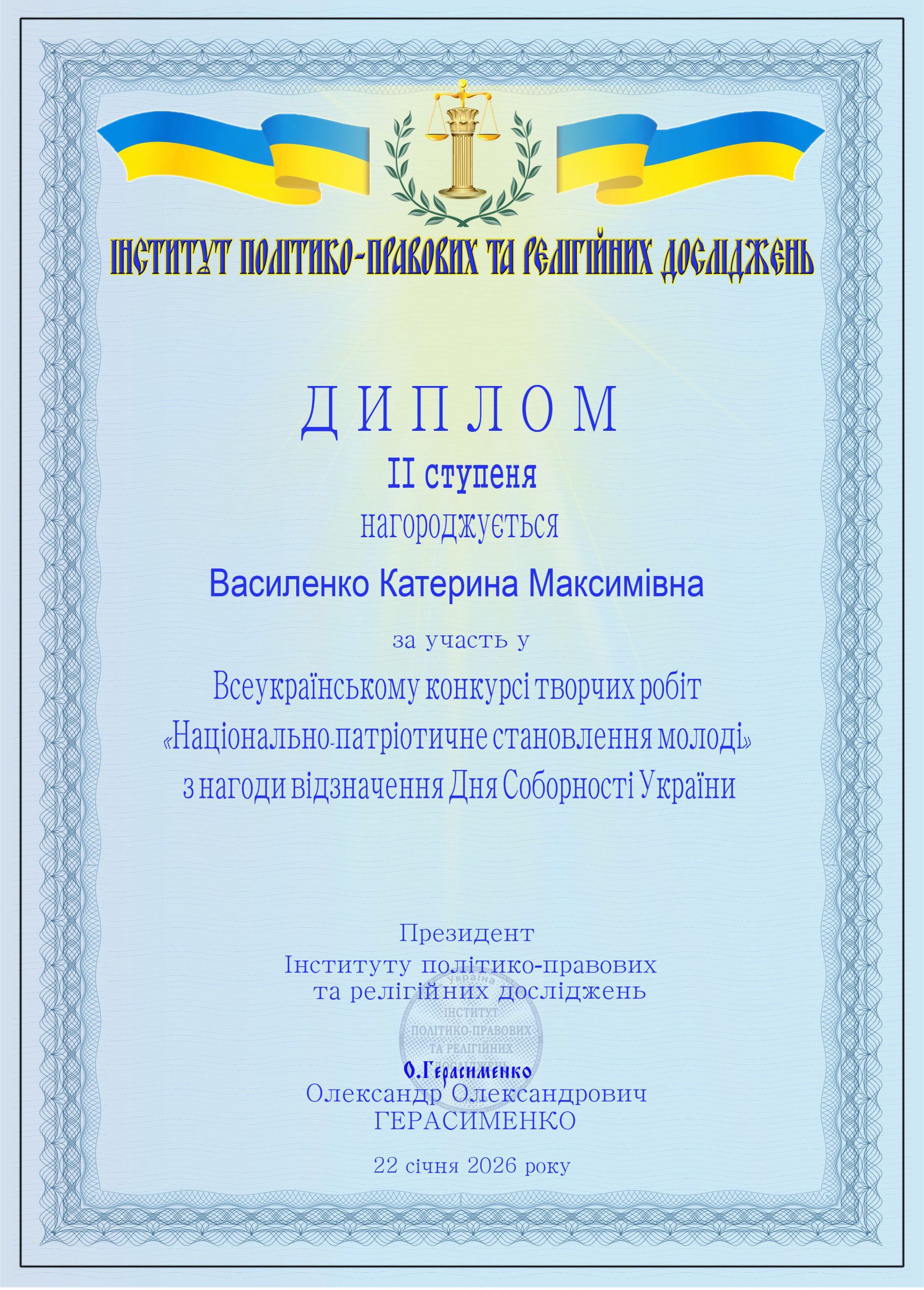 Учениця 10-Б класу Донецького ліцею №1 Василенко Катерина здобула ІІ місце у Всеукраїнському конкурсі творчих робіт «Національно-патріотичне становлення молоді», присвяченому Дню Соборності України.